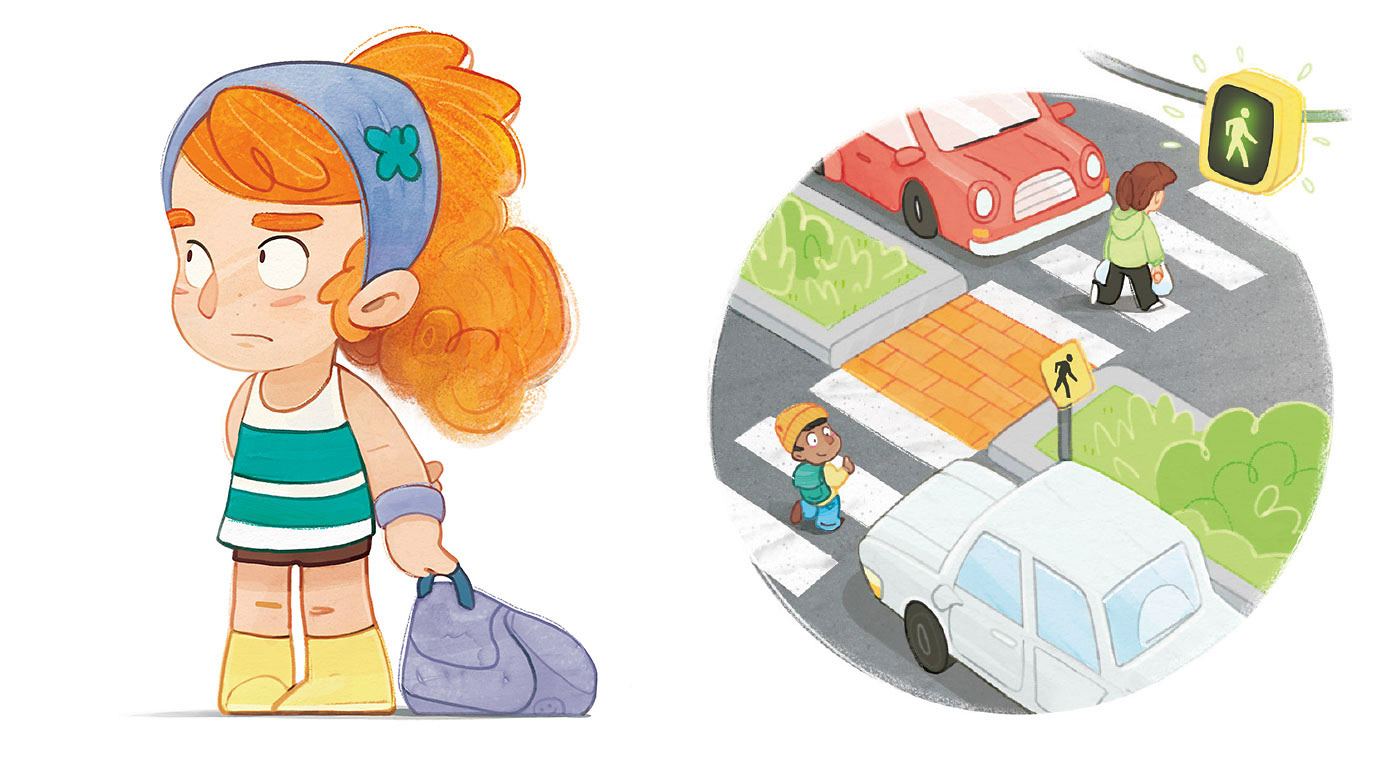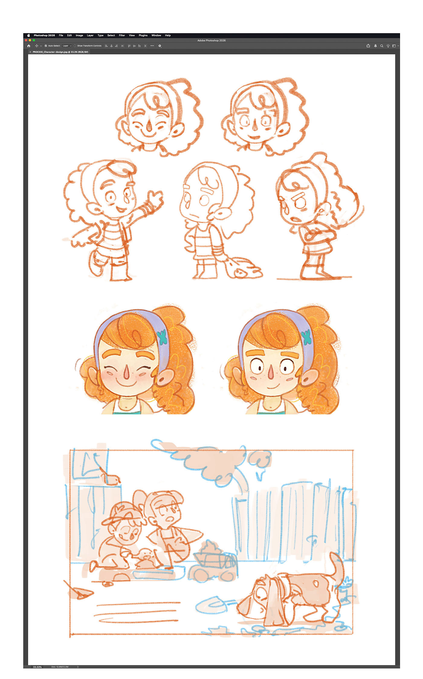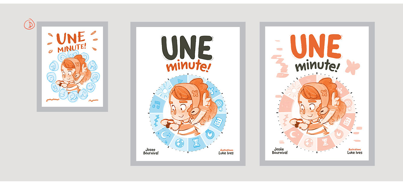 Since the cover character appears throughout the book, I began by quickly exploring her look and personality, then shared my favourite version with my editor. Cleaning up a few loose sketches with tighter lines and a touch of colour helps communicate the idea and sell the concept.